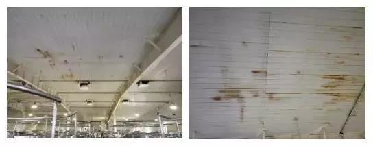 某生產(chǎn)車間頂棚防腐項目頂棚采用金屬板、巖棉復合鋼板,由于金屬頂棚板面防腐漆質(zhì)量較差,生產(chǎn)車間內(nèi)部溫度、濕度較高,最終導致室內(nèi)頂棚金屬板銹蝕嚴重。