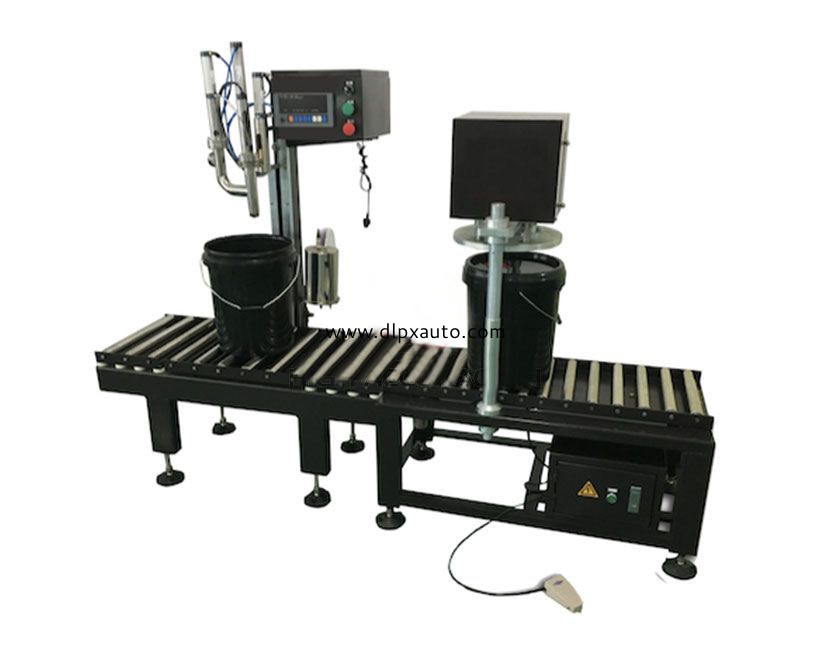 應(yīng)用案例YCS/20L高灌稱重式灌裝機 + 排氣壓蓋機YCS-P/20L由稱重傳感器、儀表控制系統(tǒng)、灌裝系統(tǒng)、封蓋機構(gòu)、機架、輥道等組成。操作簡介:人工移上桶;手動啟動;自動開啟輸料泵及大小給料閥門;到設(shè)定工作點1自動關(guān)快給料閥門;到設(shè)定工作點2自動停輸料泵并關(guān)慢給料閥門;人工放蓋移桶至壓蓋位置;腳踏開關(guān)控制壓蓋,壓蓋結(jié)束人工移桶, 入庫。功能特點1.灌裝方式:液面上灌裝(頂部灌裝)。2.控制方式