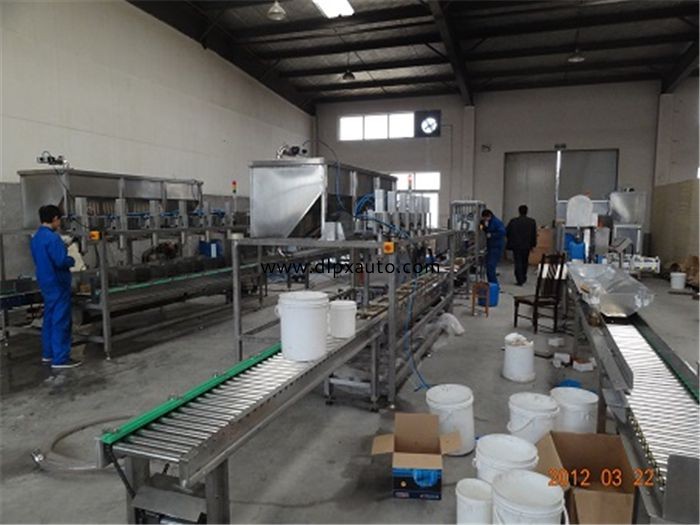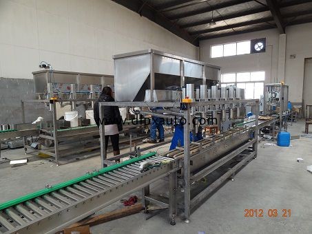 產(chǎn)地:上海特點:全自動,效益高,整套生產(chǎn)線適用范圍:石化、化工、日化,制藥,食品,農(nóng)藥等流體使用說明手紅放桶一自動輸送一6頭自動定位稱重灌裝 自動理蓋一 自動旋蓋一 重 量檢測一-自動貼標- -自動噴碼一輸送到碼垛位一 半自動碼垛- 托盤輸送-叉車運走2.產(chǎn)品介紹:2.1.采用稱重灌裝傳感器,使用穩(wěn)定、壽命長;2.2. PLC控制稱重,高精度;2.3.雙速灌裝(開始時快速灌裝,接近目標量時慢速灌裝