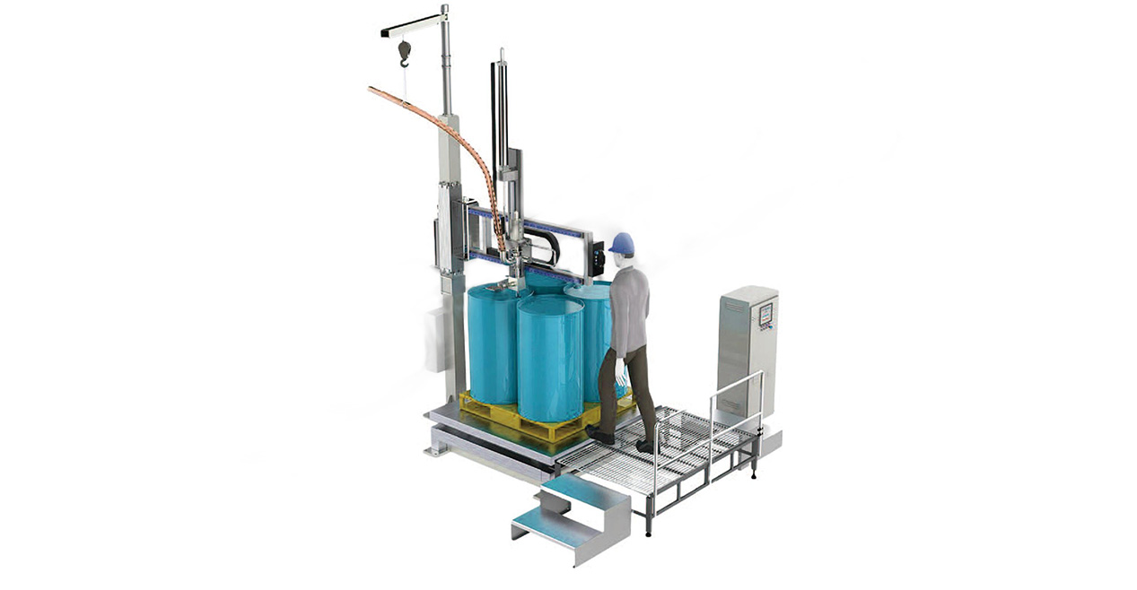 200L/IBC 搖臂式液體灌裝機 設備概述:本機專門針對100-1500kg的產(chǎn)品包裝而設計。本機利用稱重的工作原理來實現(xiàn)灌裝量的控制。物料自行流入(或通過泵供料輸送)待裝容器中去。本機灌裝部通過粗細雙管路實現(xiàn)快灌裝和慢灌裝,且灌