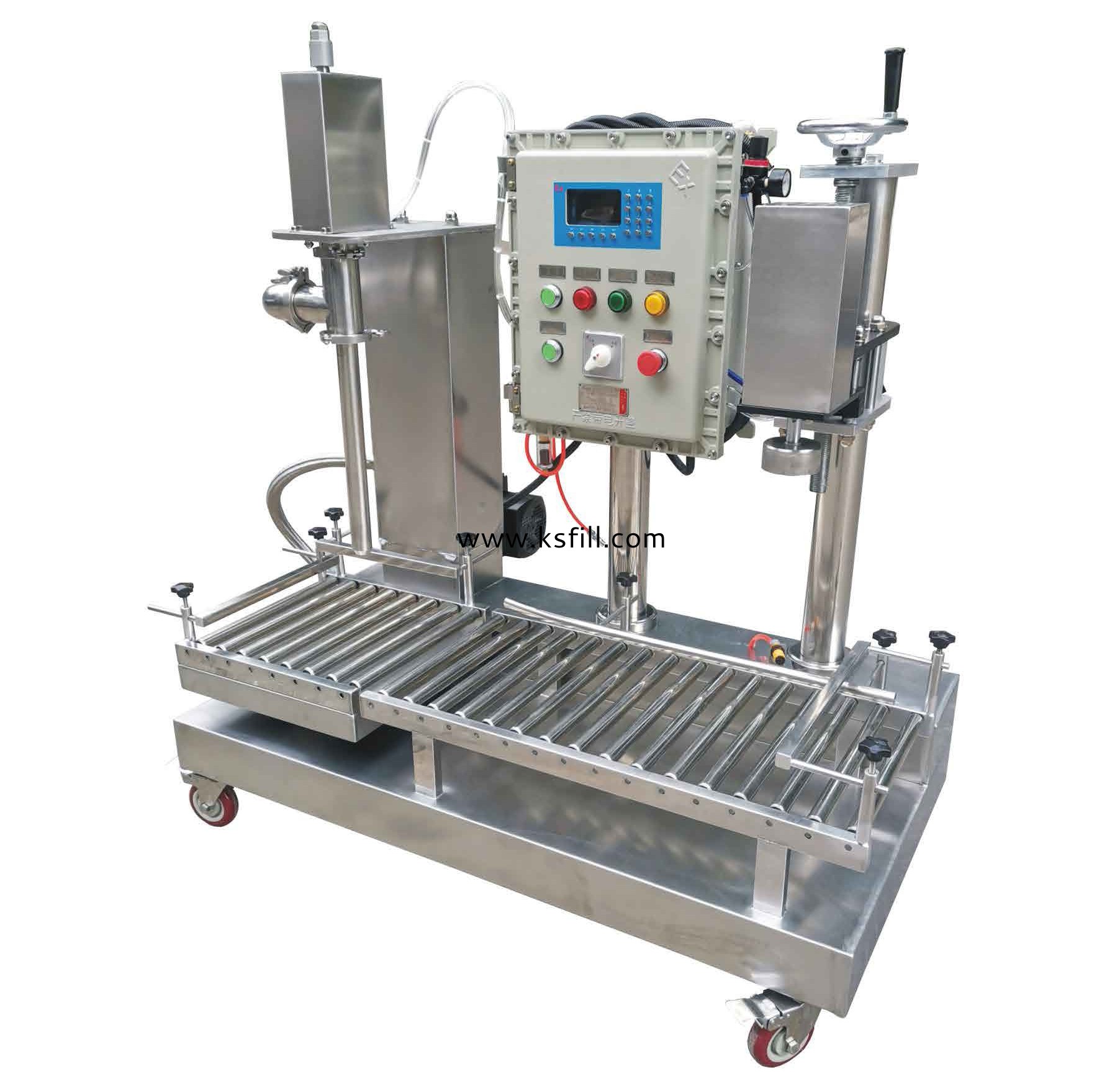 適用于:化工、食品、醫藥原料的定量灌裝量系統采用PLC可編程控制器制造,安全可靠。口灌裝頭、管路采用快速接頭,拆洗方便。日采用兩段式自動灌裝方式,準確度高。■當灌裝頭未插入桶內時,自動提嘴。回到達灌裝目標值,灌裝頭自動升起。凈重/毛重二種灌裝方式自由選擇。口可設定和存貯30組配方供調用。