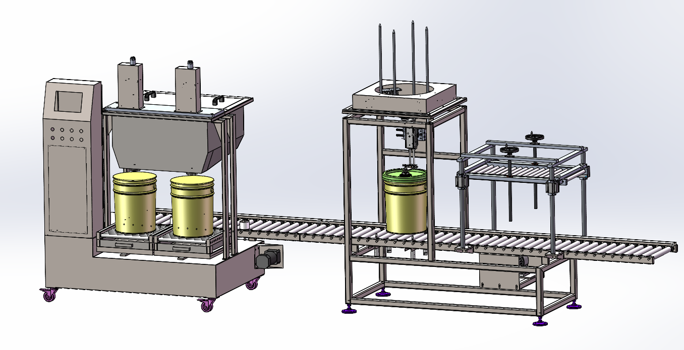 4.人工上蓋、緊蓋,蓋好蓋子的桶移出灌裝工位,上蓋壓蓋,然后借助斜坡滾筒下到地面;或者動力滾筒輸送出生產線;如果是小蓋,可以增加氣動馬達旋蓋機,人工旋蓋即可。