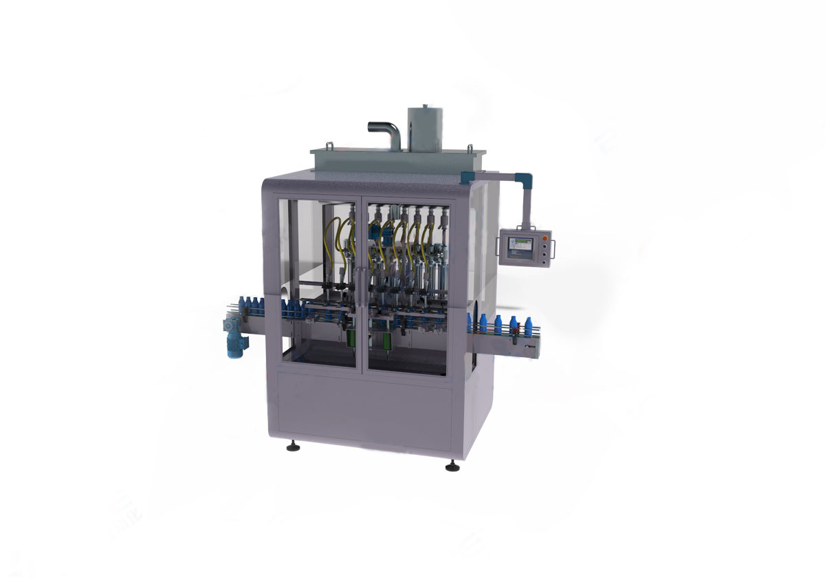 該產品為我公司精心設計的多頭伺服活塞式液體灌裝機。用于50ml-1000m1的液體灌裝,下料頭可深入桶底灌裝,可以有效減少泡沫