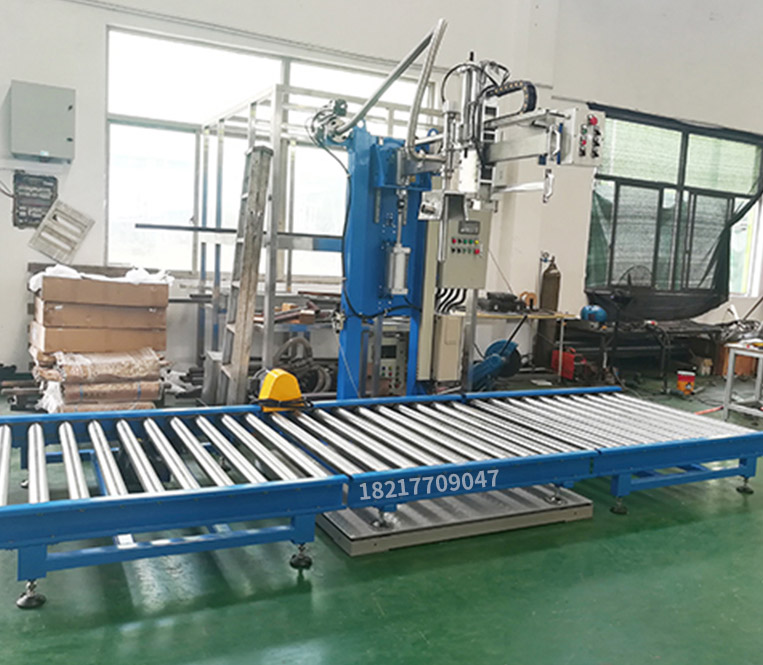 灌裝流程:人工上桶,自動輸送,自動開蓋,自動對口,自動灌裝,自動擰蓋,人工碼垛.