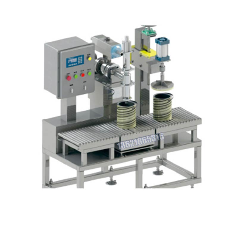 人工將空桶放到秤臺上,然后點擊啟動按鈕,儀表首先判桶并扣除空桶皮重,灌裝頭下降并插入桶內并打開進入快速落料,當達到慢進料設定重量時,自動轉為慢速落料。當重量達到目標值時停止落料,此時灌裝頭復位到初始狀態,儀表回皮顯示總重,人工將成品桶移出并人工放蓋推到壓蓋區,腳踏開關啟動,壓蓋氣缸伸出并壓蓋,壓蓋完成人工取下桶,整個動作流程結束。