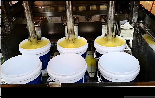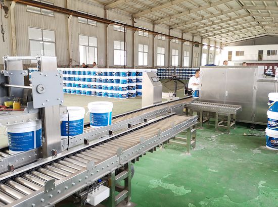 自動進桶,多頭灌裝,潛入桶底灌裝,稱重定量灌裝,自動供蓋,自動分蓋上蓋,自動封蓋。