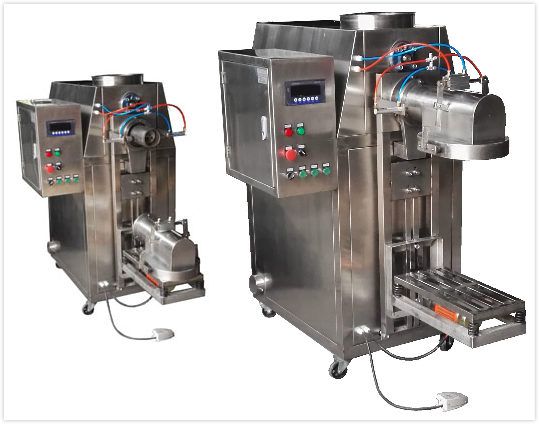 將閥口包或敞口袋裝袋套在加料嘴上,按動“允加”按鈕,這時壓袋氣缸開始工作并壓住袋口,控制器將包裝袋重量自動去除,破拱電機緩慢轉(zhuǎn)動,保證下料暢通。加料螺旋高速轉(zhuǎn)動迅速將物料灌入袋中,隨袋中空氣一起溢出的粉塵通過吸塵器由除塵器吸走,振動裝置同時啟動將托盤上袋中物料振實充滿袋角。待加料快到設定值時,加料螺旋進行減速慢加,到設定值時,加料停止。誤差<0.3%。這時壓袋氣缸松開袋口,翻袋氣缸將托盤翻轉(zhuǎn),將物料翻倒在皮帶輸送機上及時送出。