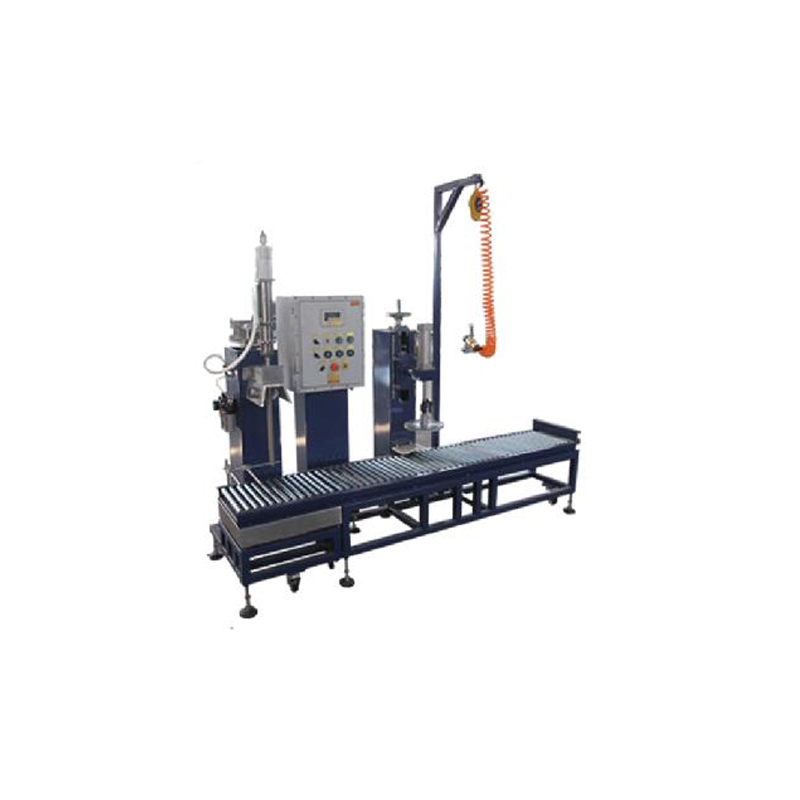 人工將空桶放至稱重磅臺上,點擊啟動按鈕,儀表首先扣重,然后進入快速落料,達到一定重量時轉為慢速落料。當重量即將達到目標值時停止落料,此時儀表回皮,代表計量完成,灌裝完畢,人工放蓋將桶推至輸送線,輸送線自動將桶輸送至壓蓋處,自動壓蓋完成人工將成品桶移走!